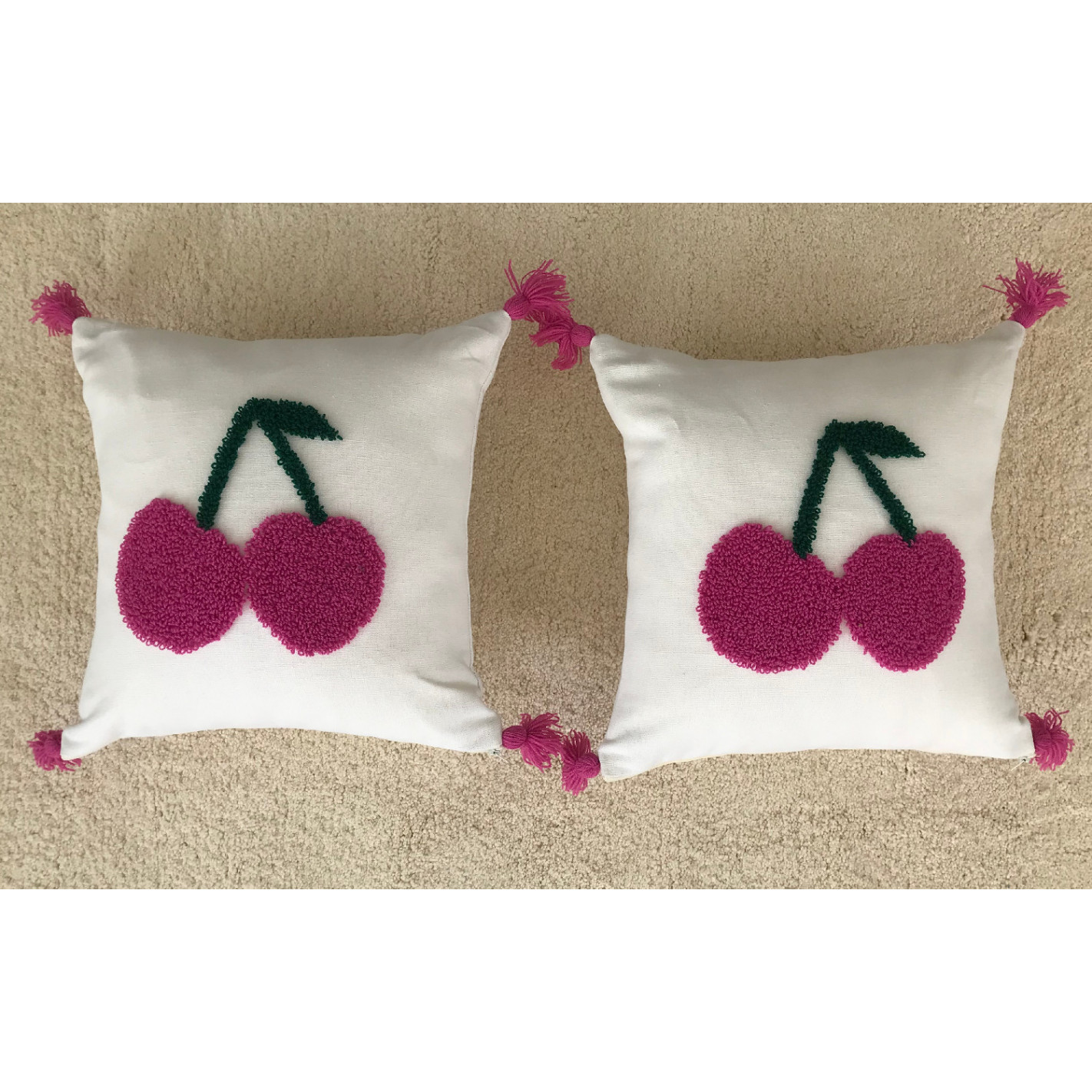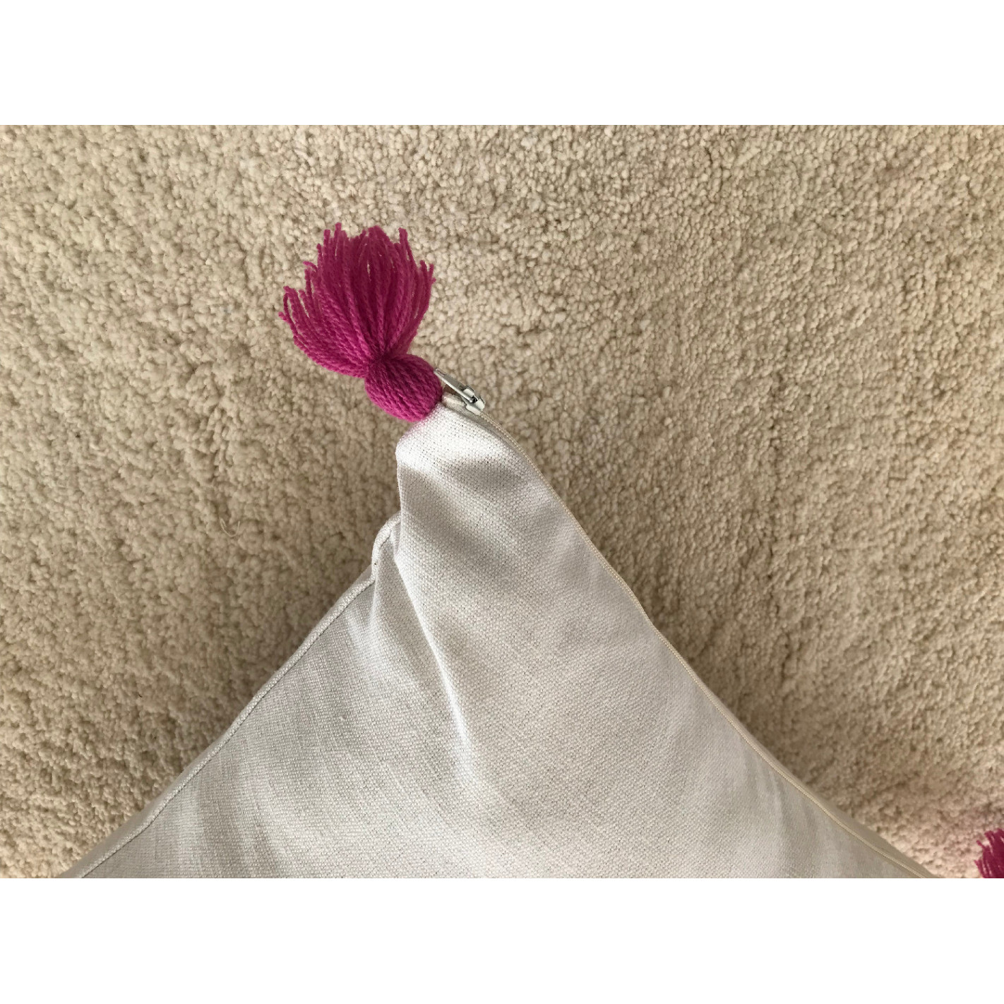 Ecru cushion with mustard yellow graphic motifs with pompoms 40x40cm