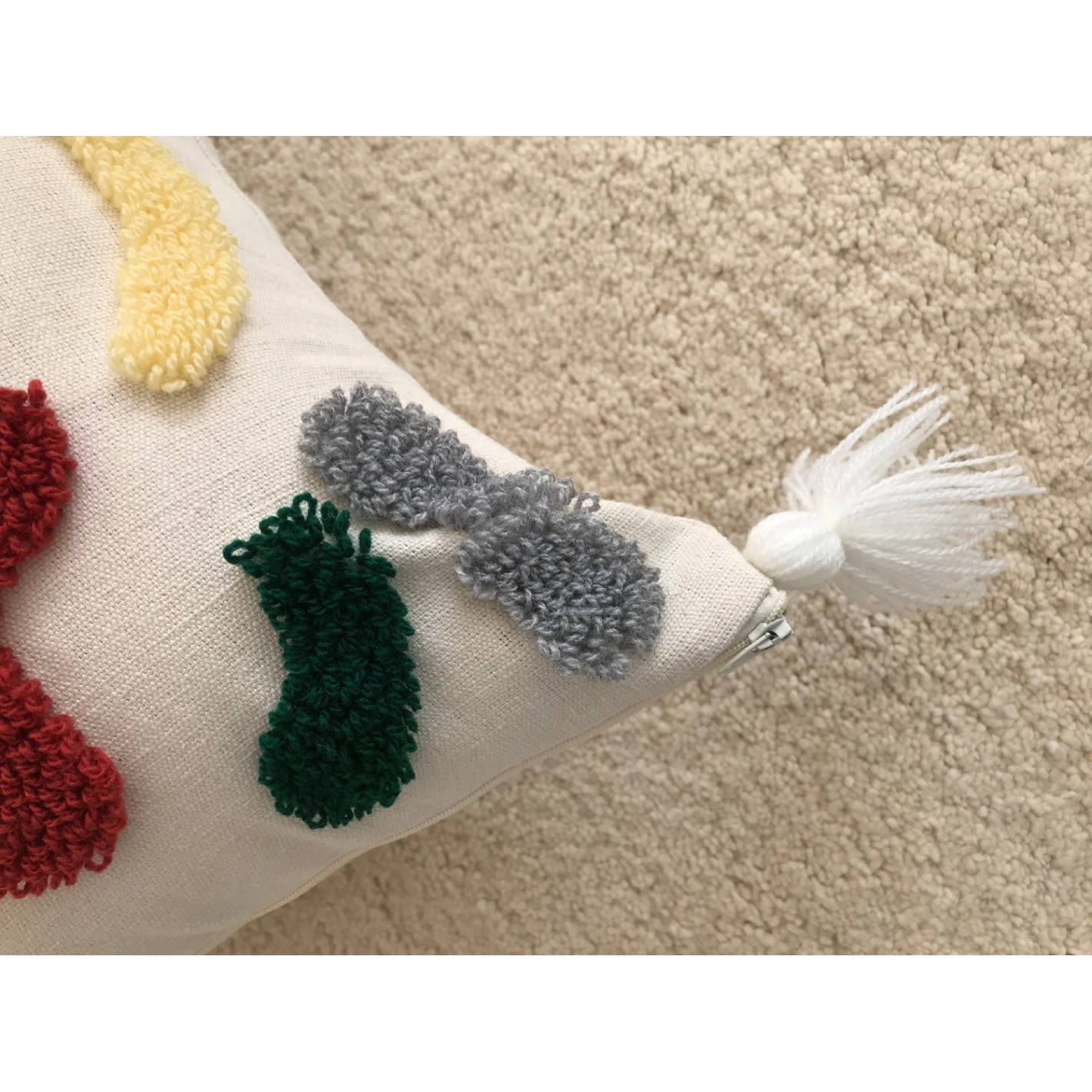 Ecru cushion with mustard yellow graphic motifs with pompoms 40x40cm