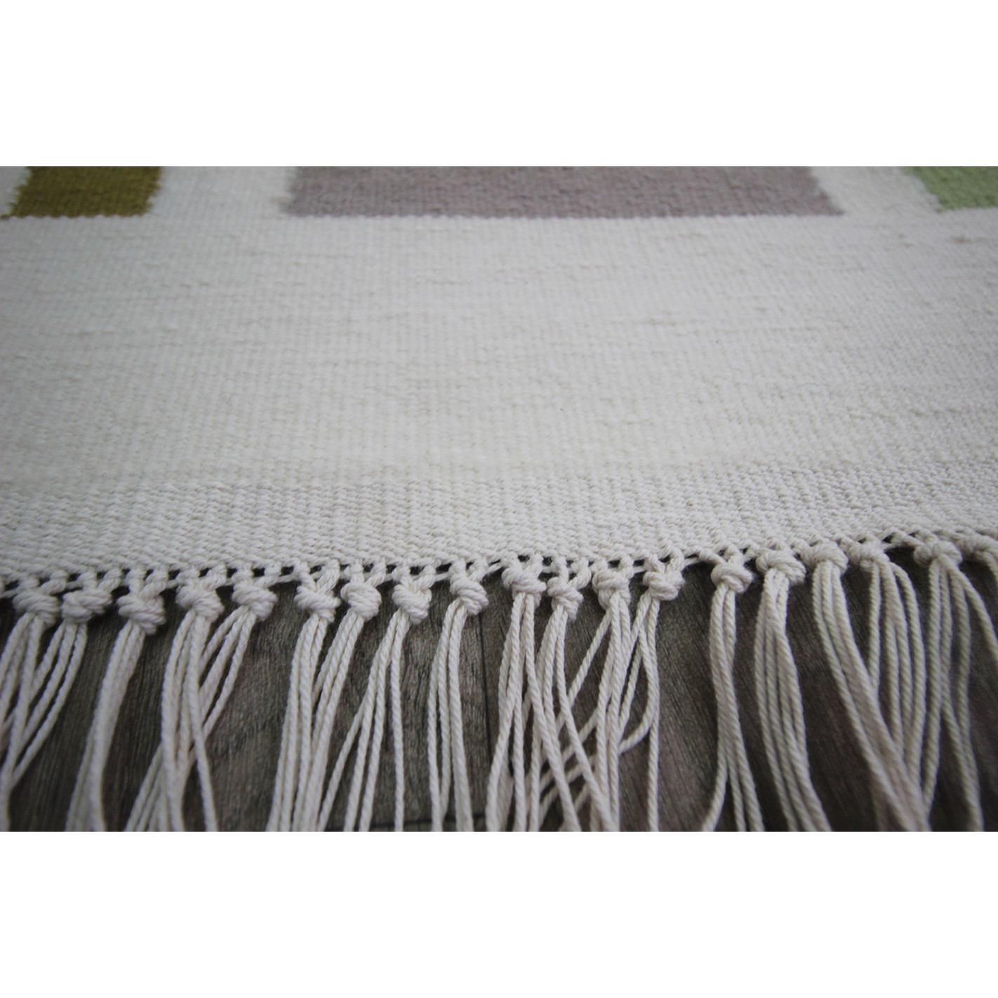 Kilim style carpet with fringes white background geometric pattern