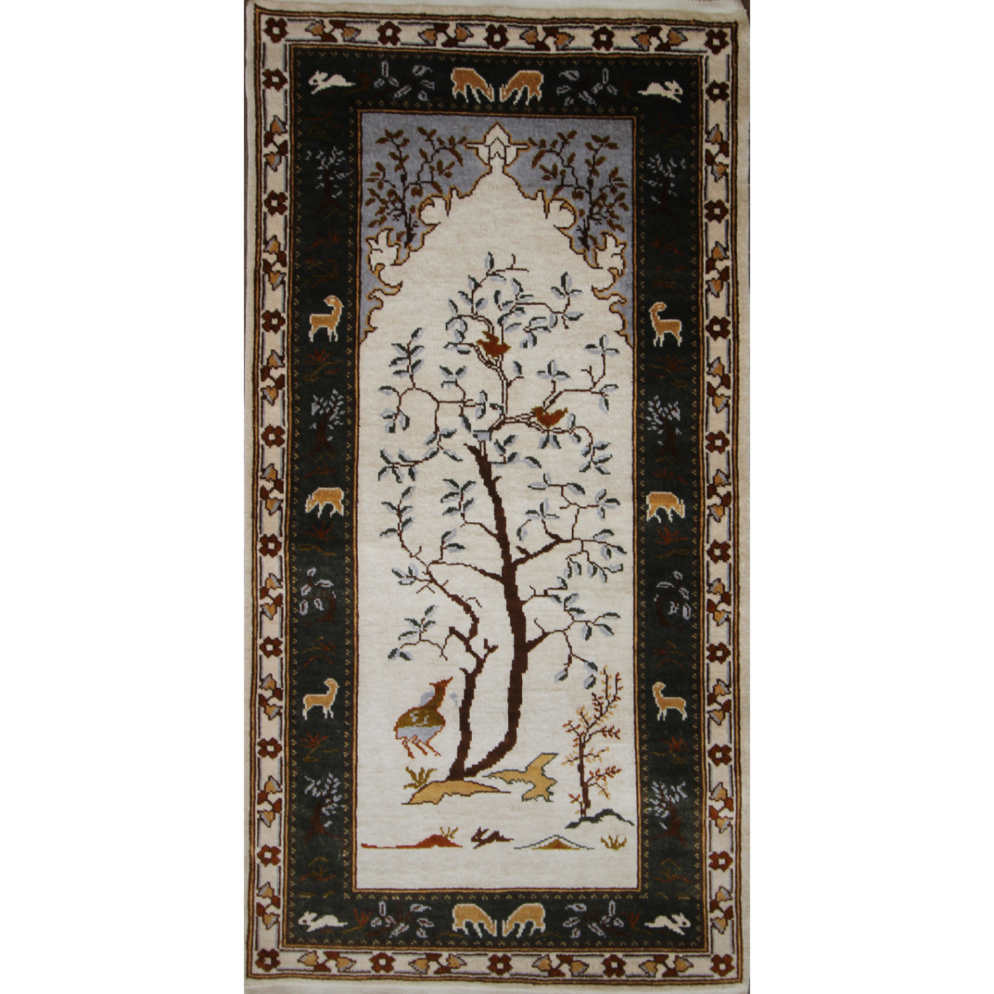 Tapis persan authentique en Soie originaire de la Tunisie. C'est un tapis entièrement noué très fin à la main, solide et de haute qualité. Sur un fond blanc vous trouvez un magnifique arbre de vie avec des fleurs et des oiseaux.
